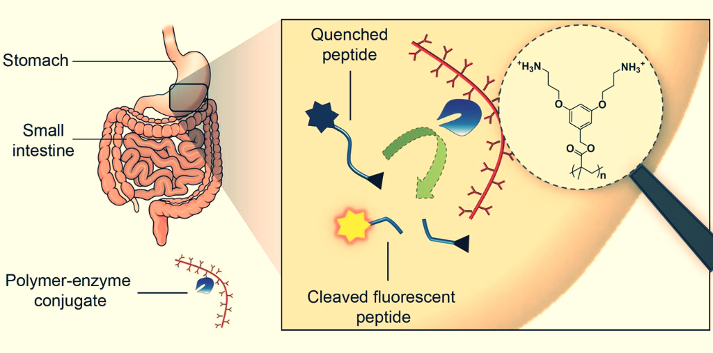 The gastrointestinal system represents a particularly harsh milieu in which proteins are degraded by proteases and extreme variations of pH (Fuhrmann et al., Pharm Res (2014)). We have developed an innovative approach for the stabilisation of therapeutic enzymes after oral ingestion. For this, a novel non-invasive assay to evaluate oral exogenous enzymes in vivo was designed (Fuhrmann et al., Proc Natl Acad Sci (2011)). This assay represents the first-time description of the real time measurement of activity of therapeutic enzymes in the gastrointestinal tract using coeliac disease as model disease (i.e., an inflammatory disease of the small intestine (Pinier and Fuhrmann et al., Am J Gastroenterol (2010)).